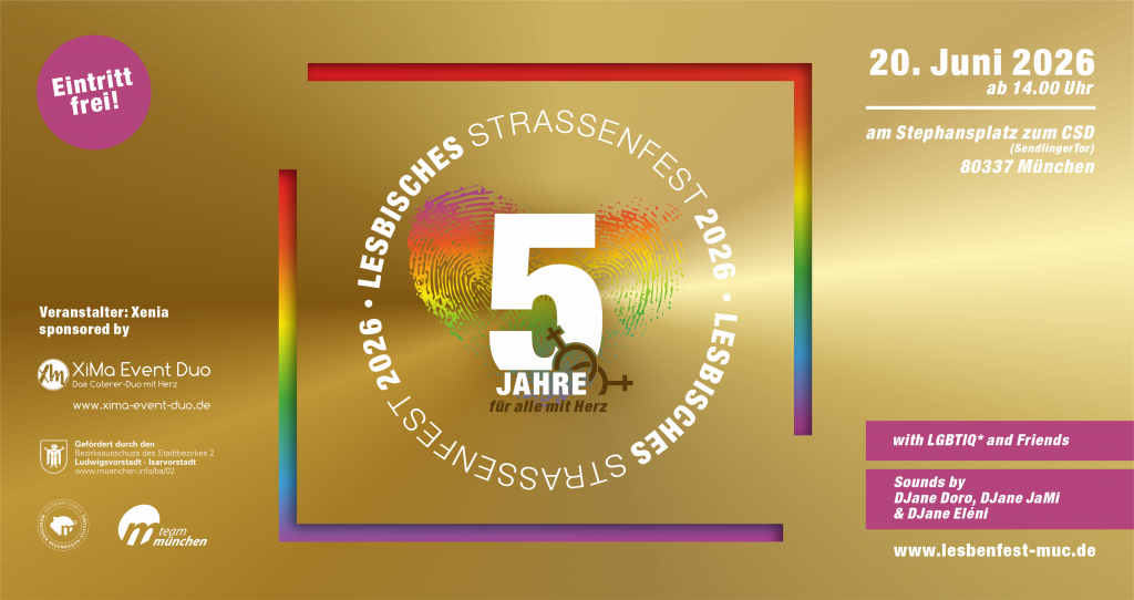 (03/2026) Am 20. Juni findet zum fünften Mal das lesbische Straßenfest am Stephansplatz statt. In Kooperation mit Team München fördert die Münchner Regenbogen-Stiftung die Bühne beim Straßenfest.
